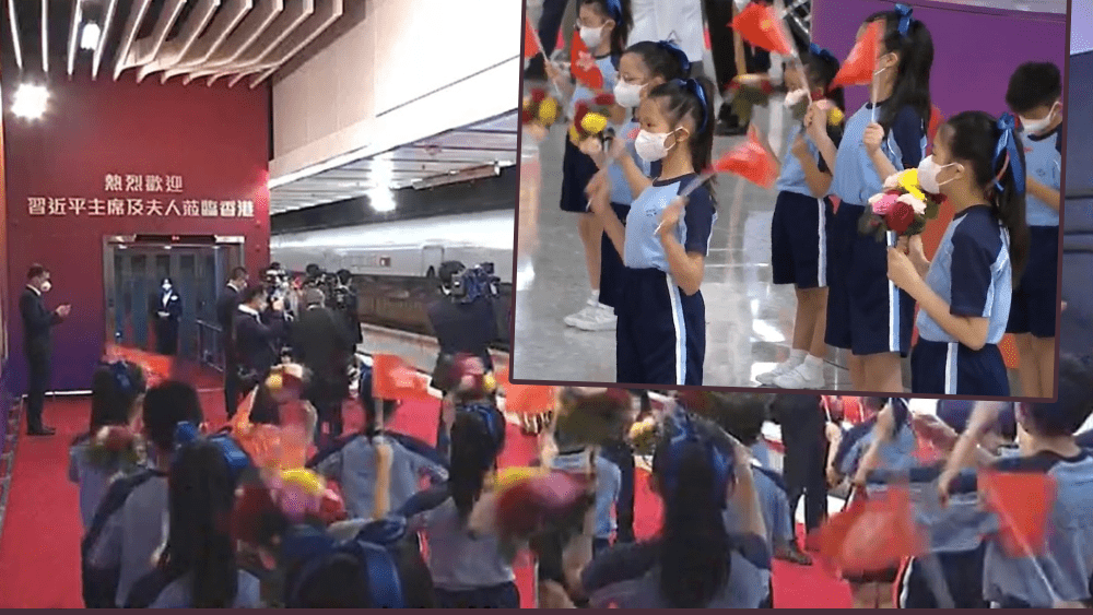 另外,在高鐵站內,黃楚標小學安排約40名男女學生到場歡迎習近平伉儷。學生都身穿藍色運動服,分別持着國旗、區旗或花束,而女學生頭上都統一戴上藍絲帶。
